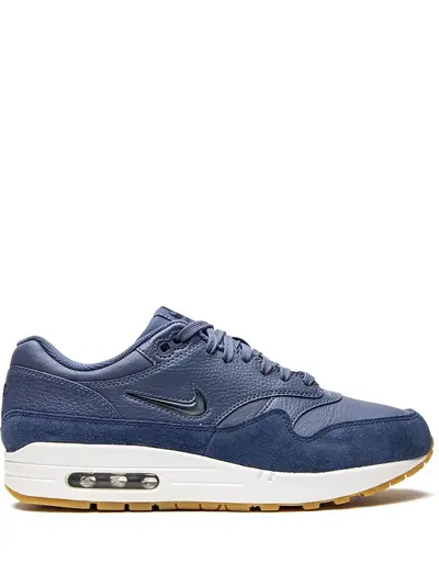 Diffused blue suede Air Max 1 Premium sneakers from NIKE featuring suede, branded insole, flat rubber sole, front lace-up fastening, signature Swoosh logo detail, logo patch at the tongue and signature Air Max sole. These styles are supplied by a premium sneaker marketplace. Stocking only the most sought-after footwear, they source and curate some of the most hard to find sneakers from around the world..