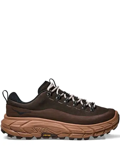 brown lace-up fastening pull-tab at the heel ridged sole vibram sole