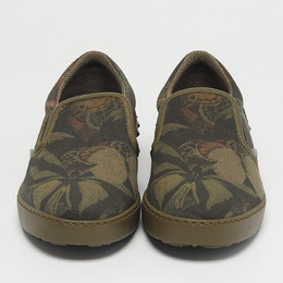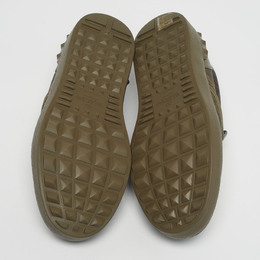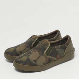 Valentino fuses casual comfort with house codes in these slip on sneakers, combining green printed canvas with leather accents. Signature studs add appeal to the low top profile.