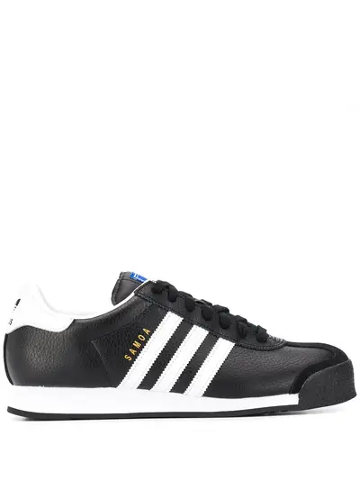 Black and white leather Samoa low top sneakers from adidas featuring a signature three stripe detail, a logo to the outside, a logo patch at the tongue, a printed logo to the rear, a round toe, a front lace up detail, a flat sole and a flat heel. POSITIVELY CONSCIOUS: Adidas Group scores 4 out 5 by independent ethical brand rating agency Good On You. It uses eco-friendly materials in many products - 100% of its cotton is from sustainable sources and it's committed to use 100% recycled polyester by 2024. It traces and audits almost all of its supply chain to ensure good labour standards, and has committed to reduce carbon and water stress across its whole supplier base.