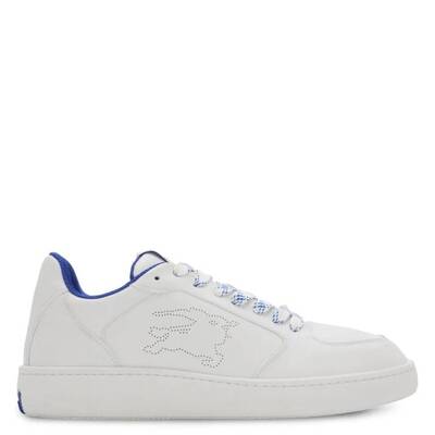 Burberry Mens Sneakers. SKU: 8095424. Color: White. These Italian-made sneakers are crafted from smooth calf leather and feature perforations in the shape of Burberrys Equestrian Knight Design. Lined with breathable mesh, the style is finished with oversized check laces and rubber soles embossed with archive Burberry lettering. Additional details include a lace-up closure, rounded toe, an Equestrian Knight Design label on the tongue, and a leather insole for enhanced comfort. Upper: 100% calf leather. Made in Italy. <br/><br/><b>Please visit the brand website for sizing information.</b>