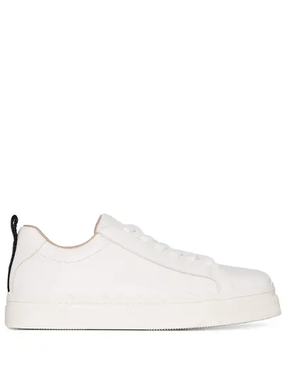 These white Chloé Lauren low top leather sneakers feature a round toe, front lace-up fastening, an embossed tongue, logo print heel tab and a flat rubber sole with a scalloped trim. Cue the trumpets because we're preparing for a ceremonial unboxing of these Chloé trainers. It's a day that will go down in history.