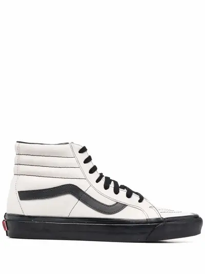 Off white/black suede Sk8-Hi suede panelled sneakers from VANS featuring ankle-length, panelled design, contrast stitching, logo patch to the side, round toe, front lace-up fastening, logo patch at the tongue, embossed logo to the side, branded insole and flat rubber sole.