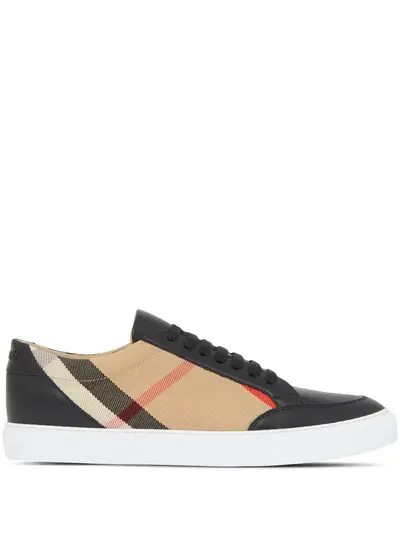 House Check-print lace-up sneakers from BURBERRY featuring archive beige, jet black, house check pattern, front lace-up fastening, round toe, flat rubber sole and calf leather-blend.