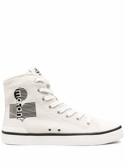 Chalk logo-print lace-up sneakers from ISABEL MARANT featuring logo print to the side, logo patch at the tongue, front lace-up fastening, round toe and flat rubber sole.