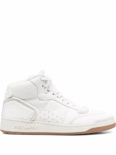 White leather lace-up hi-top sneakers from SAINT LAURENT featuring embossed logo to the side, perforated detailing, front lace-up fastening, round toe, ankle-length and chunky rubber sole.