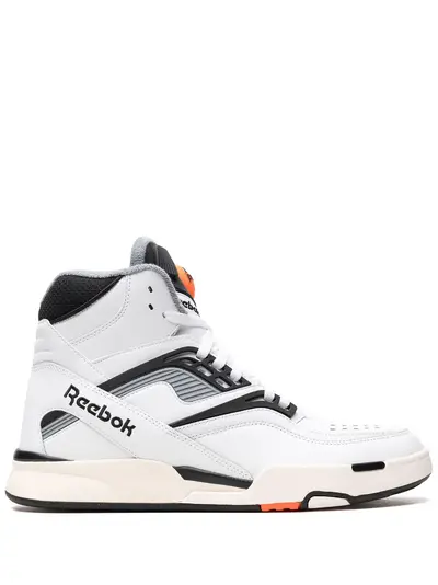 Pump high-top sneakers from REEBOK featuring white/black, calf leather, perforated detailing, logo print to the side, logo-print tongue, front lace-up fastening and rubber outsole.