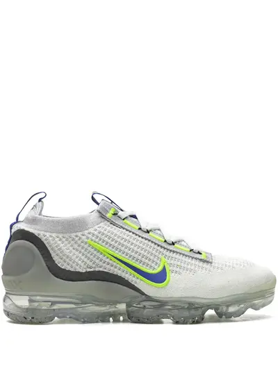 Air Vapormax 2021 FK "White Royal Volt" sneakers from Nike featuring mesh panelling, signature Swoosh logo detail, round toe, front lace-up fastening, double pull-tab at the opening, rubber sole and grey/blue/yellow. These styles are supplied by a premium sneaker marketplace. Stocking only the most sought-after footwear, they source and curate some of the most hard to find sneakers from around the world..
