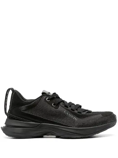 logo-detail mesh sneakers from Lanvin featuring black, calf suede, panelled design, mesh panelling, logo print to the side, logo patch at the tongue, front lace-up fastening, round toe, logo pull-tab at the heel and chunky rubber sole.