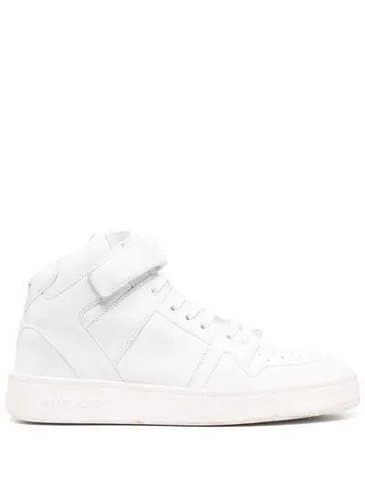 logo-lettering leather sneakers from SAINT LAURENT featuring optical white, calf leather, gold-tone logo lettering, logo-debossed tongue, round toe, ankle-length, front touch-strap over lace-up fastening and flat rubber sole.
