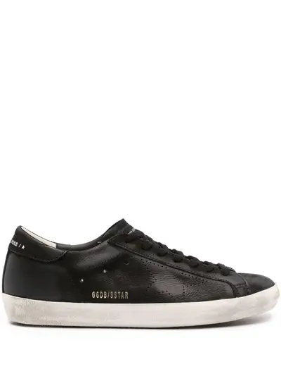 Super-Star leather sneakers from Golden Goose featuring black, calf leather, perforated logo detail, round toe, front lace-up fastening, logo-print tongue, logo print to the rear, branded insole and rubber sole.
