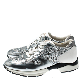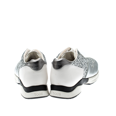 Tod's Metallic Silver Glitter And Leather Sportivo Lace Up Sneakers Size 36 215174
