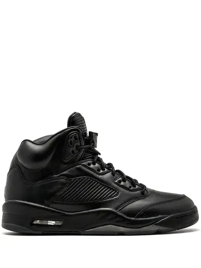 Black leather Air Jordan 5 Retro Prem sneakers from jordan featuring a round toe, a lace-up front fastening, a logo patch at the tongue, a padded ankle and a rubber sole. These styles are supplied by a premium sneaker and street wear marketplace. Stocking only the most sought-after footwear and clothing, they source and curate some of the most hard-to-find items from around the world.