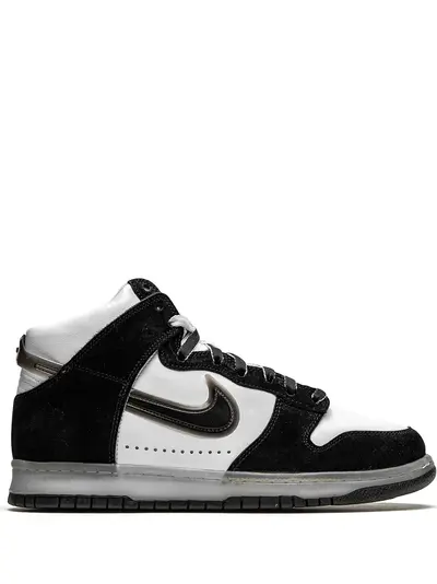 White/black leather Dunk High sneakers from NIKE featuring two-tone design, suede trim, round toe, front lace-up fastening, signature Swoosh logo detail and ridged rubber sole. These styles are supplied by a premium sneaker marketplace. Stocking only the most sought-after footwear, they source and curate some of the most hard to find sneakers from around the world..