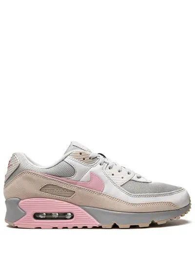Air Max 90 low-top sneakers from NIKE featuring grey, beige, pink, leather, signature Swoosh logo detail, contrasting panel detail, round toe, front lace-up fastening, logo patch at the tongue, branded insole and rubber sole with Max Air cushioning. These styles are supplied by a premium sneaker marketplace. Stocking only the most sought-after footwear, they source and curate some of the most hard to find sneakers from around the world..