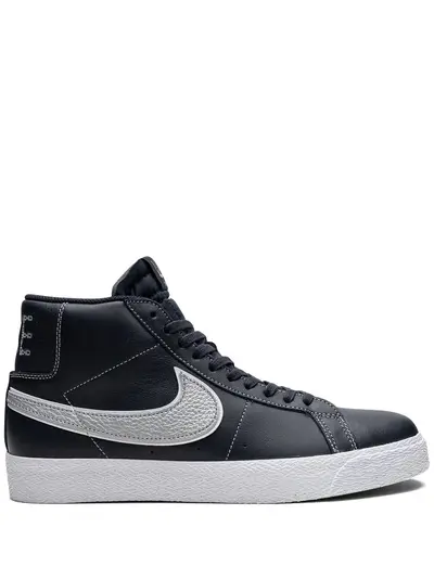 x Mason Silva Zoom Blazer Mid SB sneakers from Nike featuring black, calf leather, signature Swoosh logo detail, round toe, front lace-up fastening, logo patch at the tongue, embroidered logo to the rear, branded insole and rubber sole. These styles are supplied by a premium sneaker marketplace. Stocking only the most sought-after footwear, they source and curate some of the most hard to find sneakers from around the world..