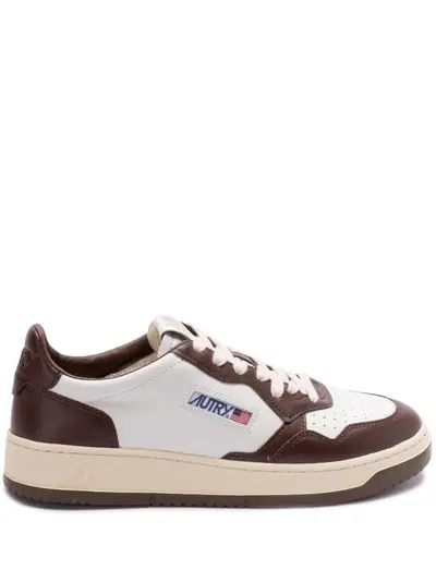 brown/white calf leather panelled design front lace-up fastening debossed logo to the rear logo patch to the side logo patch at the tongue perforated toebox round toe branded insole flat rubber sole