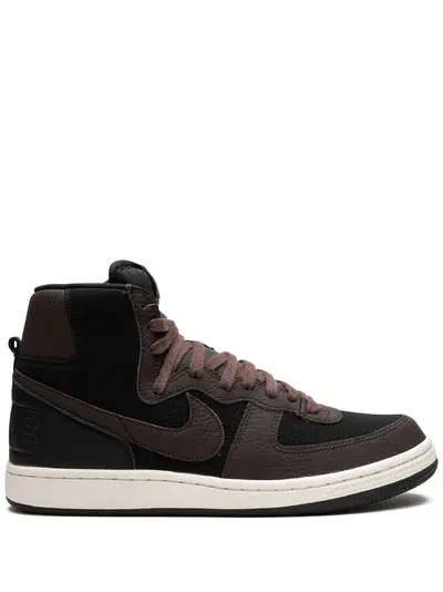 Terminator High "Velvet Brown" sneakers from Nike featuring purple, black, cotton, leather, signature Swoosh logo detail, round toe, front lace-up fastening, logo patch at the tongue, pull-tab at the heel, branded insole, rubber sole and Release date: March 21, 2023. These styles are supplied by a premium sneaker marketplace. Stocking only the most sought-after footwear, they source and curate some of the most hard to find sneakers from around the world..