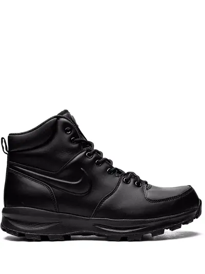 Black leather Manoa lace-up boots from NIKE featuring signature Swoosh logo detail, round toe, front lace-up fastening, logo patch at the tongue, ankle-length, branded insole and rubber sole.