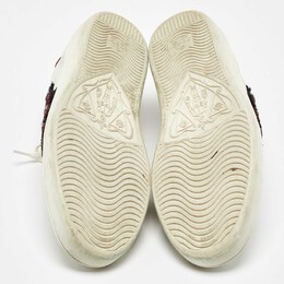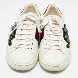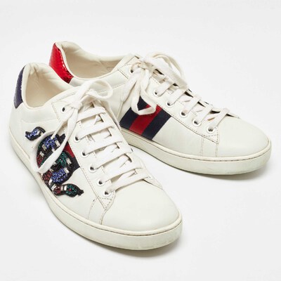 Stacked with signature details, this Gucci pair is rendered in leather and is designed in a low cut style with lace up vamps. The white sneakers have been fashioned with the iconic web stripes and crystal embellished snake motif on the sides. Complete with red and green trims carrying the brand label on the counters, these shoes can be easily coordinated with your casuals.
