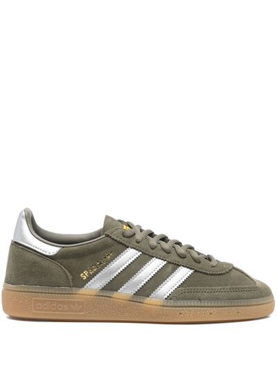 khaki calf suede front lace-up fastening contrasting heel counter logo patch at the tongue signature 3-Stripes logo round toe branded insole mesh lining gum-rubber sole