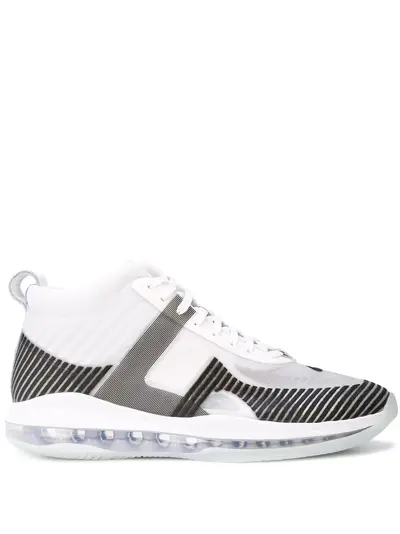 White LeBron x John Elliott Icon QS sneakers from Nike featuring an almond toe, a lace-up front fastening, an ankle length, a signature Nike swoosh, a brand embossed tongue, a pull tab at the rear and a cushioned air sole.