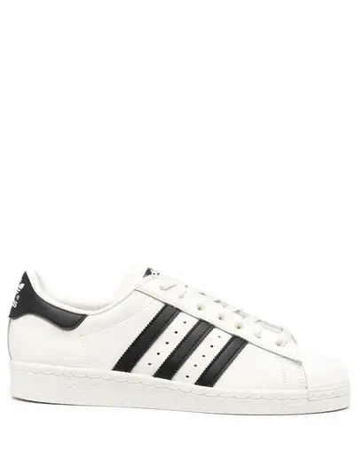 Super Star 82 low-top sneakers from adidas featuring white, black, leather, round toe, front lace-up fastening, branded heel counter, branded leather insole and flat rubber sole.
