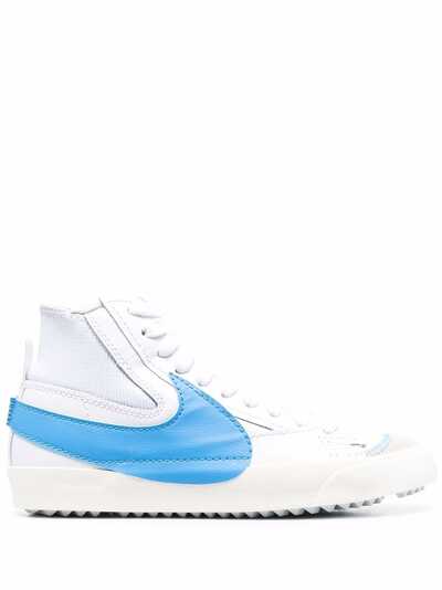 White/university blue sail leather logo-print high-top sneakers from NIKE featuring panelled design, elasticated panelling, contrast stitching, signature Swoosh logo detail, round toe, front lace-up fastening, logo patch at the tongue, branded insole and flat rubber sole.