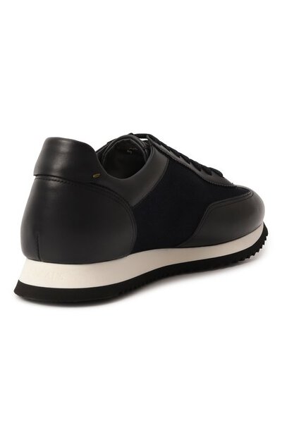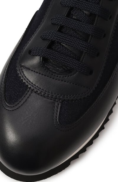 Кроссовки с гибкой легкой подошвой выполнены из комбинации гладкой кожи и плотного текстиля. Язычок украшен тисненым логотипом марки, а задник — фирменными стежками.