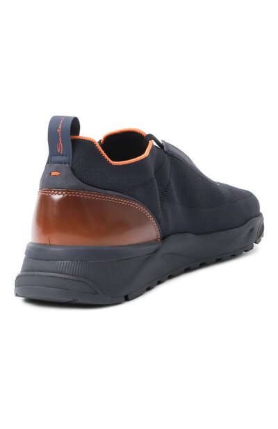 Кроссовки Innova на широкой подошве выполнили из трикотажа. Шнуровку укрепили накладкой из нубука в тон, а на заднике разместили нашивку из глянцевой кожи с патиной. Вырез подчеркнули кантом фирменного оранжевого оттенка, в тон которому — логотип на петле и стежки.