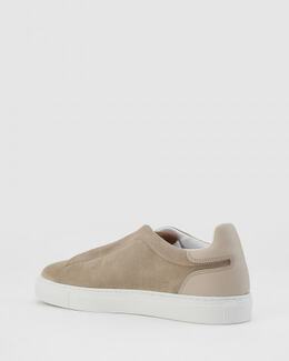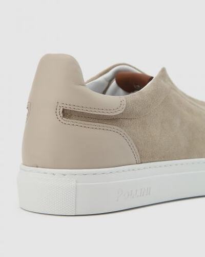 Кроссовки Pollini из натуральной замши в бежевом цвете. Удобные кроссовки на каждый день, выполненные из мягкой замшевой кожи. Вместо стандартной шнуровки в этой модели используются эластичные ленты, позволяющие быстро снимать и надевать пару. Подошва из резины, подкладка и стелька из натуральной кожи.