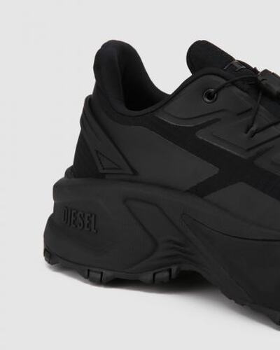 Кроссовки Diesel в чёрном цвете. Эти мужские кроссовки сочетают в себе спортивный и смелый городской стили. Изготовленные из прочного рипстопа с отделкой из термополиуретана, эти кроссовки оснащены эластичной системой быстрой шнуровки, дышащей подкладкой и цепкой резиновой подошвой с ультра толстым профилем.