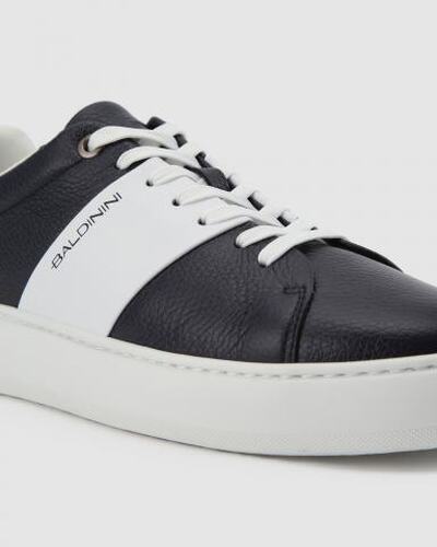 Кроссовки Baldinini из кожи в тёмно-синем цвете. Кроссовки в сдержанном дизайне будут уместны не только на прогулке, но и в офисе с нестрогим дресс-кодом. Пара выполнена из сочетания гладкой и зернистой кожи тёмно-синего и белого цвета, с фирменным логотипом бренда сбоку. Дизайн завершает резиновая подошва. Внутри текстильная подкладка.