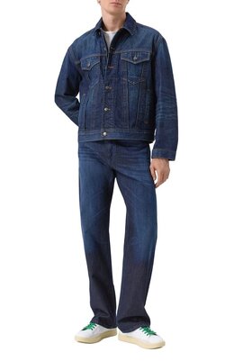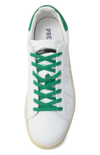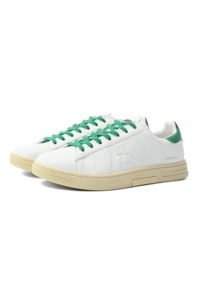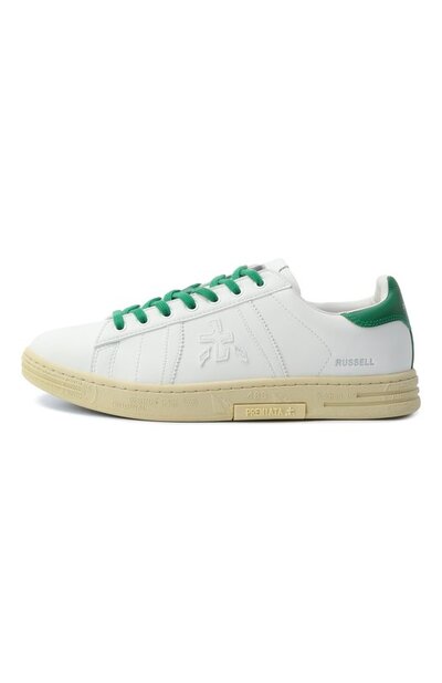 Кеды Russell сшили из полимера и кожи. В тон шнуровке выполнили брендированную накладку сзади. На берцах разместили фирменные иероглифы, а подошву украсили оттисками в виде печатей и штампов.