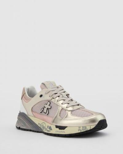 Комбинированные кроссовки Premiata в оттенках розового и золотого добавят в образ нотку нежности. Модель выполнена из текстиля, с вставками из кожи и замши. Внутри подклад и стелька также из кожи, подошва – из резины. Оригинальность дизайна достигается за счет сочетания нескольких фактур, фирменного принта и розовой шнуровки. Кроссовки подойдут для расслабленных образов с брюками и джинсами.