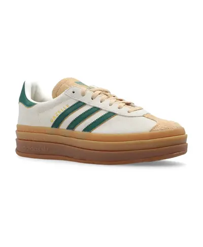 Бежевые, зелено-коричневые кроссовки GAZELLE BOLD W от ADIDAS Originals. Эта пара на шнуровке, выполненная из кожи, украшена фирменными тремя полосками бренда и наборной резиновой подошвой коричневого цвета. Высота подошвы: 4 см. Высота подошвы в самой высокой точке: 4,5 см.