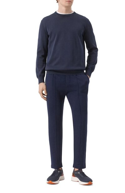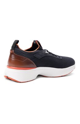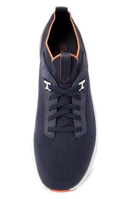 Кроссовки Bounce из сетчатого трикотажа поставили на контрастную амортизирующую подошву, окрасив ее часть в фирменный оттенок Arancio Santoni. Оранжевым деталям вторят узкая полоса на манжете пары и стежок на заднике из патинированной кожи. Модель с замшевыми накладками на шнуровке дополнили двумя петлями.