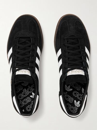 Впервые представленные в 1979 году, кроссовки Adidas Originals 'Handball Spezial' являются основой линейки спортивной одежды бренда и выпускались в различных цветах на протяжении многих лет. Эта пара имеет черный замшевый и белый кожаный верх и коричневую резиновую подошву, что сохраняет их верность гандбольным корням.