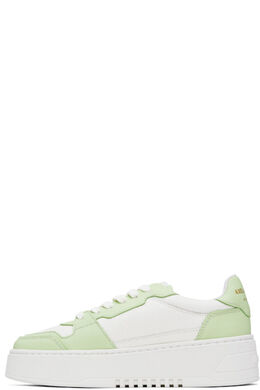 Низкие кроссовки из полированной кожи ручной работы белого и зеленого цвета. · Перфорация на носке · Шнуровка · Нашивка с логотипом из букле на мягком холщовом язычке · Мягкий воротник · Печать с логотипом на внешней стороне · Тисненые логотипы по бокам и на пятке · Подкладка из сетки и замши · Тисненый логотип на резиновой подошве платформы · Резиновая подошва с протектором · Платформа: H2"