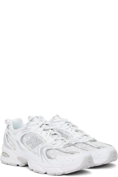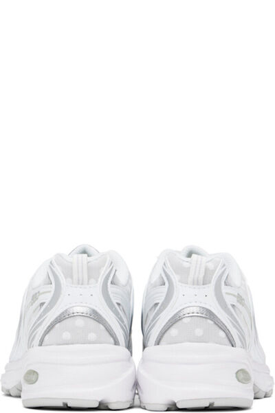 Низкие кроссовки из зернистой искусственной кожи и сетки серебристого и белого цвета. · Жаккардовый узор в горошек по всей поверхности · Перфорированная отделка на носке · Шнуровка · Логотип, напечатанный на мягком язычке · Мягкий воротник · Аппликация логотипа по бокам · Петля на воротнике пятки · Перфорированная отделка на заднике · Сетчатая подкладка · Промежуточная подошва из вспененной резины ABZORB® · Резиновая подошва с протектором