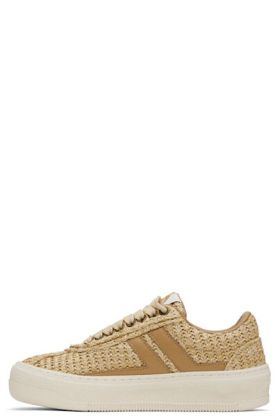 Низкие плетеные кроссовки из искусственной рафии бежевого цвета. · Шнуровка · Нашивка с логотипом на мягком язычке · Мягкий воротник · Аппликации с логотипом из полированной телячьей кожи по бокам · Флажок с логотипом на внешней стороне · Тисненый логотип на пятке · Подкладка из зернистой телячьей кожи · Резиновая подошва с протектором