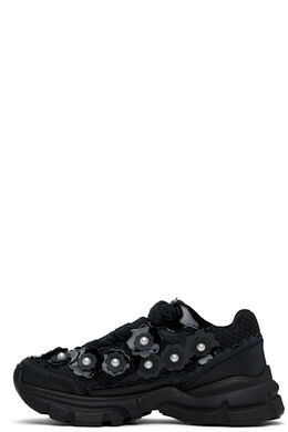 Низкие текстурированные плетеные кроссовки из смеси переработанного хлопка и переработанного полиэстера черного цвета. Цветочные аппликации из лакированной кожи и искусственный жемчуг по всей поверхности. · Ручная работа · Отделка из полированной кожи и зубчатой лакированной кожи по всей поверхности · Шнуровка · Вышитый логотип на мягком язычке · Мягкий воротник · Вышитый логотип на внешней стороне · Подкладка из джерси · Тисненый логотип на межподошве · Резиновая подошва с протектором