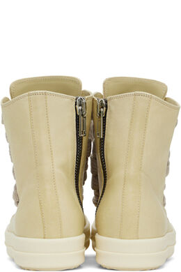 Высокие кроссовки из зернистой овчины бежевого цвета. · Носок из телячьей кожи · Шнуровка · Застежка-молния и люверсы с внутренней стороны · Подкладка из полированной телячьей кожи · Резиновая подошва с протектором