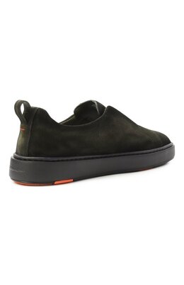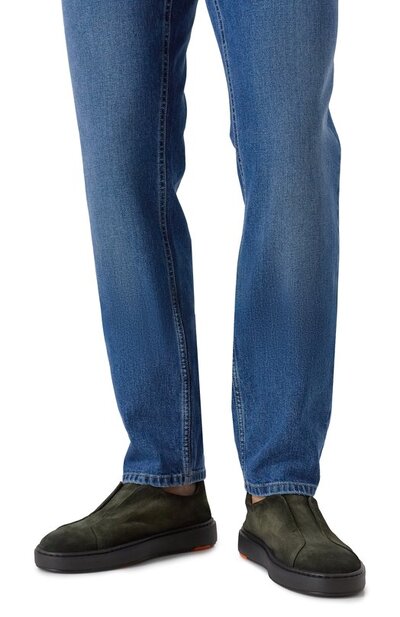 Кеды Cleanic из замши, окрашенной в технике velatura, отделали внутри гладкой кожей. На принадлежность пары без шнуровки марке указывают тисненые логотипы сбоку и на язычке, стежок знакового оттенка Arancio Santoni на заднике и фирменный декор double-buckle на подошве внизу.