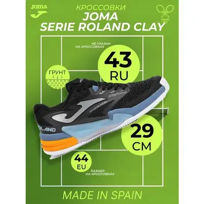 Мужские теннисные кроссовки JOMA SERIE ROLAND Clay разработаны для достижения максимальной производительности в профессиональном теннисе. Эта модель протестирована профессиональными теннисистами. Они сочетают в себе высокую износостойкость, лёгкость и технологичную поддержку, и становятся идеальными для динамичных матчей и тренировок.Легкая и дышащая верхняя часть изготовлена из сетки, отделанной жаккардом. Верх из прочного жаккардового нейлона дополнен перфорацией VTS — система вентиляции обеспечивает приток воздуха внутрь кроссовок и сохраняет оптимальную температуру во время долгой игры. Встроенная TPU-мембрана и элементы KPU усиливают верхнюю часть и адаптируются под индивидуальные особенности стопы.Зоны пальцев усилены технологией Protection — резиновыми накладками, защищающими от ударов и повышающими долговечность. Это снижает риск быстрого износа и выдерживает интенсивные боковые перемещения. Посадка максимально комфортна благодаря бесшовной конструкции, а мягкий воротник и язычок плотно прилегают, не оказывая давления на ногу.Sportech — инжектированная резина, которая исключает швы в конструкции верха, делая модель более лёгкой, эластичной и адаптивной. Толщина материала варьируется по зонам, что повышает уровень защиты в наиболее нагруженных участках.Dual Reactive — двухслойная промежуточная подошва из филона разной плотности, дающая одновременно хорошую амортизацию и высокую реактивность. Она эффективно гасит удары при прыжках и быстрых остановках, возвращая энергию при каждом шаге.Stabilis — жёсткая вставка в средней части, предотвращающая кручение и повышающая устойчивость при резких поворотах. Durability — износостойкая резиновая подошва с рисунком «ёлочка», специально адаптированным для движения на грунтовых покрытиях. Она создает отличное сцепление и не теряет форму даже после интенсивной игры.JOMA SERIE ROLAND Clay — это технологически продвинутые теннисные кроссовки для мужчин, которые ценят стабильность, защиту и комфорт на грунтовом корте. Благодаря сбалансированной амортизации, анатомичной посадке и прочным материалам, эта модель станет надёжным партнёром в любой игровой ситуации — от тренировок до напряжённых турниров.