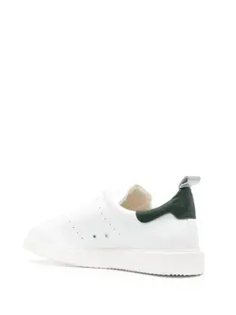 Белый, искусственная кожа, закругленный носок, шнуровка спереди, язычок с логотипом, контрастный задник, петля для подтягивания сзади и плоская резиновая подошва.