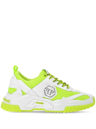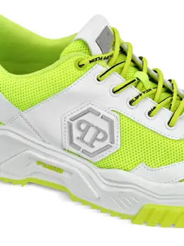 Белый, флуоресцентный желтый, вставки, сетчатые вставки, нашивка с логотипом сбоку, шнуровка спереди, закругленный носок, петля для подтягивания сзади, кожаная стелька с логотипом и массивная резиновая подошва. Это унисекс-модель. Обратите внимание, что для нее используется мужская размерная сетка.
