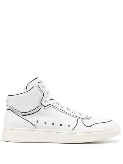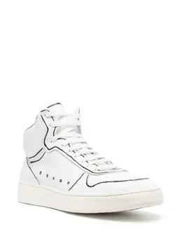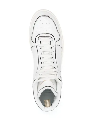 Белый, телячья кожа, принт с логотипом сзади, контрастная строчка, закругленный носок, шнуровка спереди, петля для подтягивания сзади, стелька с логотипом и плоская резиновая подошва.