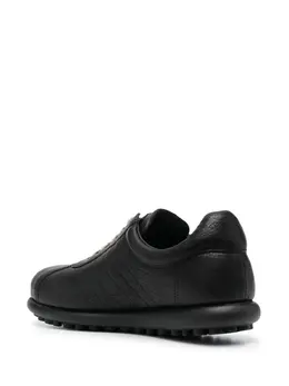Черный, телячья кожа, зернистая текстура, шнуровка спереди, стелька с логотипом, плоская подошва и закругленный носок.