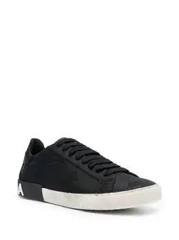 Черный, парусина, телячья кожа, жаккардовый логотип, закругленный носок, шнуровка спереди, стелька с логотипом и плоская резиновая подошва.